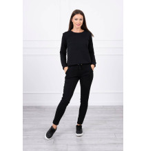 Bemutatunk egy sportkészletet. Sima pulóver nyomtatás nélkül. Nadrág zsebekkel és övvel a derekán. A készlet kiváló minőségű anyagból készül. A méret univerzális, és alkalmas lesz S, M vagy L méretű hölgyeknek.