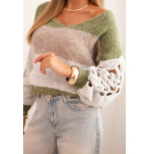 Dámsky pruhovaný sveter s vrkočmi khaki Made in Italy